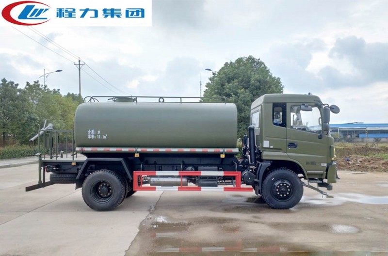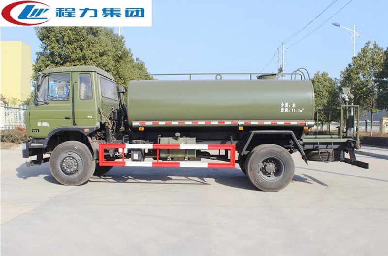 東風四驅灑水車是全國唯一可以上牌的四驅灑水車,采用4x4驅動系統,即相比普通灑水車后輪驅動,東風越野灑水車前后輪都可為驅動輪,全時四驅的模式,使其能沙漠、雪地、森林、沼澤等地形高效工作。 實際上,東風四驅灑水車正是為了滿足市場需求而參考軍車結構設計制造,即軍車民用,整車配備東風153(CPB12)駕駛室(新款為D913豪華仿天錦),康明斯ISB190 50國五發動機,六檔變速箱(具有高低檔,儀表盤上顯示為兔子烏龜燈),軸距4500mm,前橋3.8噸,后橋10噸,均為東風商橋車橋,雙層大梁設計,帶原廠ABS,選裝空調。