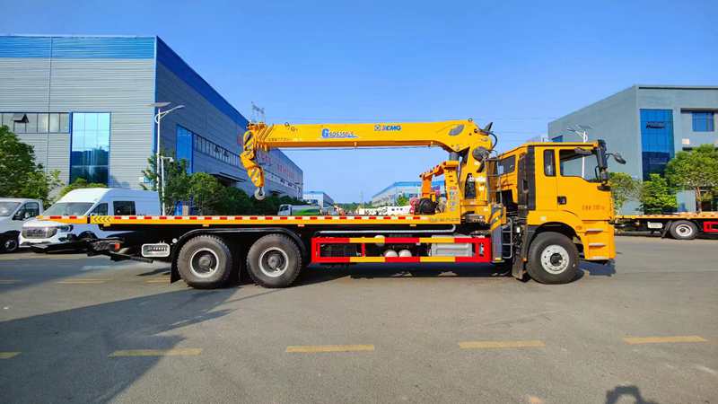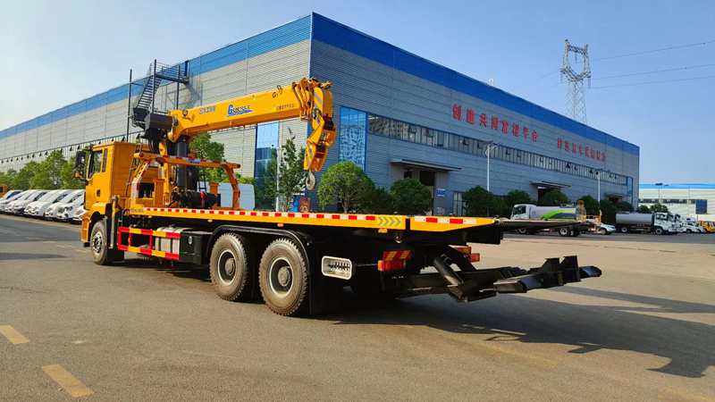 上裝配置:18噸上裝,15噸卷揚,6毫米厚花紋板,進口液壓件,18噸三 節后托臂, 平板做下沉,板總長8.5米,尾部帶1米液壓翻轉尾板,托插座壹對套,拖叉兩對,抱胎裝置一套,綁帶陸條,輔助小車,輔助氣管兩根,警燈,洗手水箱,大梁尾部加固,另配徐工12噸至14噸吊機