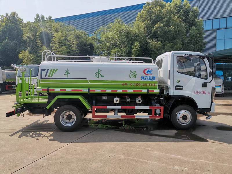 5噸灑水車,整車型號:CLW5070GPSD6,底盤配置:3308軸距,全柴136馬力發動機,萬里揚六檔變速箱,電動門窗,原廠空調,中控鎖,ABS,方向助力,斷氣剎,7.00R16鋼絲胎,前橋1.5T,后橋3.5T.上裝配置標配:罐體采用武鋼優質碳鋼Q235-B型材質,罐體厚度國標:4MM,專用功能:整車帶前沖(噴)、后灑、帶側噴(花灑)、帶后工作平臺、平臺上安裝綠化灑水高炮(炮噴射形狀可調節:直沖、大雨、中雨、毛毛雨、霧狀、可連續調節,360度旋轉),配消防接口,自流閥,濾網,配備大功率專用灑水泵,泵可自吸自排,垂直吸程≥7米,灑水寬度≥14米,高炮射程≥28米,后平臺帶30米柴油全自動霧炮。