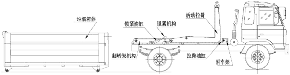 該車是由汽車底盤、拉臂主油缸、附車架、翻轉架、支撐腿(選裝)、鎖緊架、鎖緊油缸及多路換向閥等組成。翻轉架一端連在附車架上,其另一端設有活動拉臂,中間安裝有鎖緊系統;活動臂油缸一端連在活動臂上,另一端連接在附車架上;鎖緊機構通過鎖緊油缸的動作可以在箱體自卸時將附車架上的箱體與翻轉架及拉臂連為一體,在主油缸伸出時形成自卸角,也可以通過鎖緊油缸的收回把翻轉架與附車架鎖緊為一體,利用主油缸的收回或伸出使活動拉臂將地下的垃圾箱拖拉至附車架上或從附車架上放回到地面。